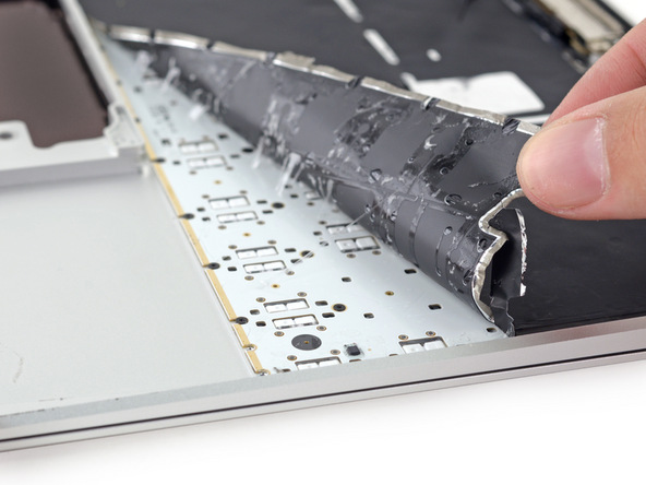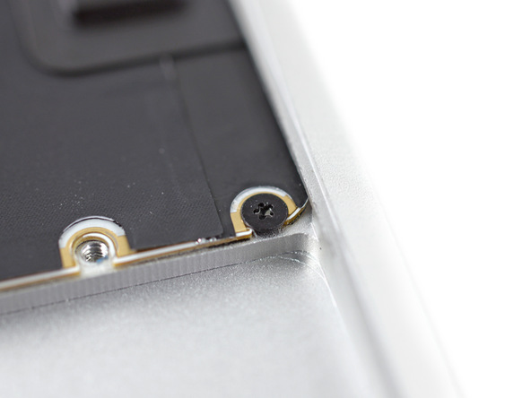 拆下三颗 Pentalobes 螺丝后,又移除了10颗有垫片的 Philips 螺丝,最后还有两颗螺丝固定。键盘底板上有大量的粘合剂。