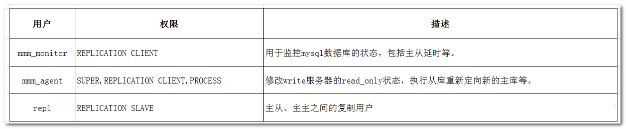 GRANT REPLICATION CLIENT ON *.* TO 'mmm_monitor'@'192.168.137.%' IDENTIFIED BY 'mmm_monitor'; GRANT SUPER,REPLICATION CLIENT, PROCESS ON *.* TO 'mmm_agent'@'192.168.137.%' IDENTIFIED BY 'mmm_agent'; flush privileges;