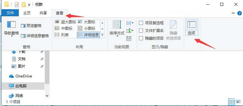 一、首先打开需要更改的文件类型的文件所在位置,然后点击上方的“查看”->然后再点击右侧的“选项”,如下图所示。