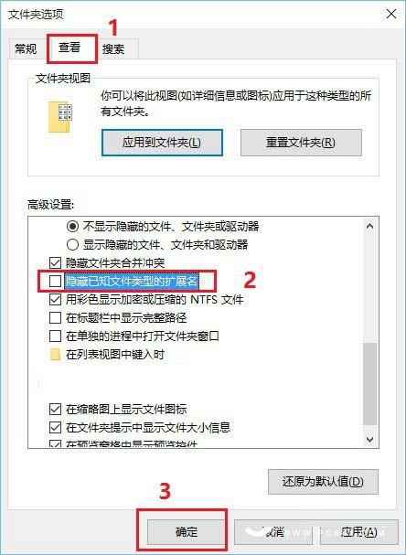 二、然后在打开的文件夹选项中,先切换到「查看」,然后在下方的高级设置中找到“隐藏已知文件类型的扩展名”,将其前面的勾去掉,并点击底部的“确定”保存,如图所示。