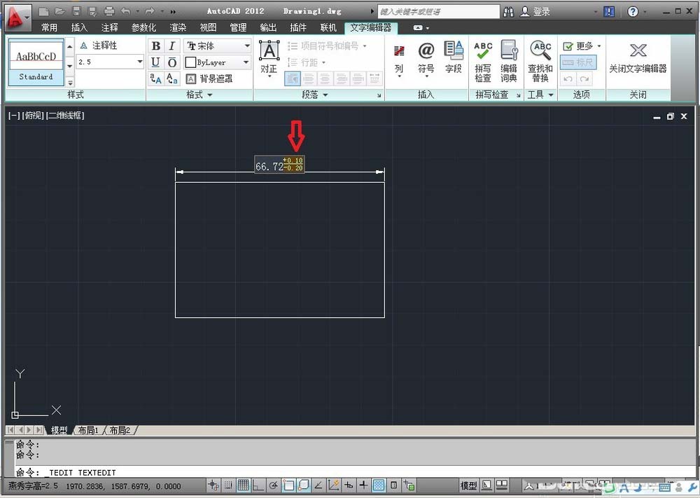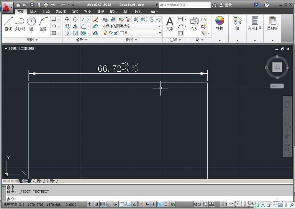1、打开一个CAD文档,现在我要将尺寸66.72标注成+0.10,-0.20的公差来。