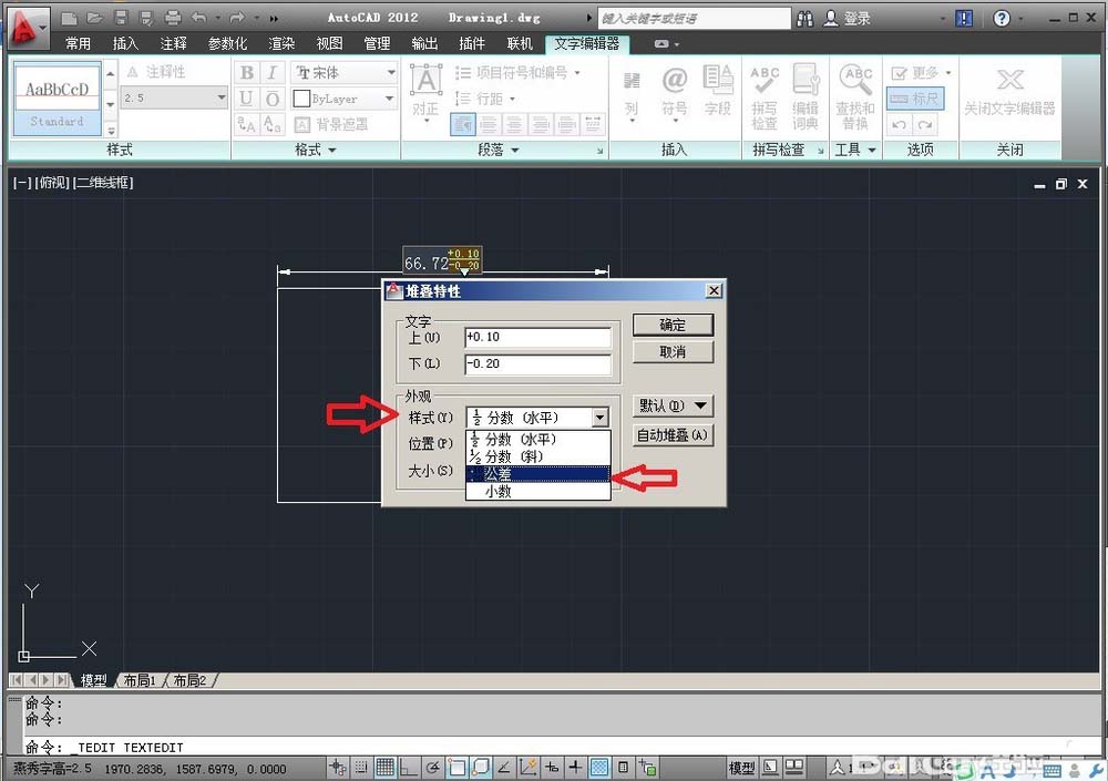 8、双击,出现”堆叠特性“,在”样式“下拉框里选中”公差,点确认即可。(这里也可以根据需要修改公差尺寸)