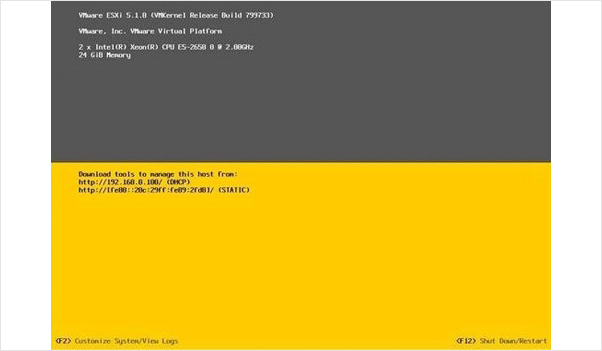 8、安装完成后,取出安装CD、DVD 或 USB 闪存驱动器。按Enter重新引导主机,安装完成重启后,就会进入ESXi5.1的控制台,可以对主机进行简单的设置。在控制台窗口中看到服务器的信息,比如服务器的CPU、内存的信息,网络IP信息。如果要访问这台主机,可以在浏览器中输入IP地址。刚安装好时,由于网络中有DHCP服务,所以ESXi5.0系统会被分配到一个IP地址。如果网络中没有DHCP,则ESXi不会获得IP地址。值得注意的是,在ESXi5.1中,首次支持IPv6的地址。如图9