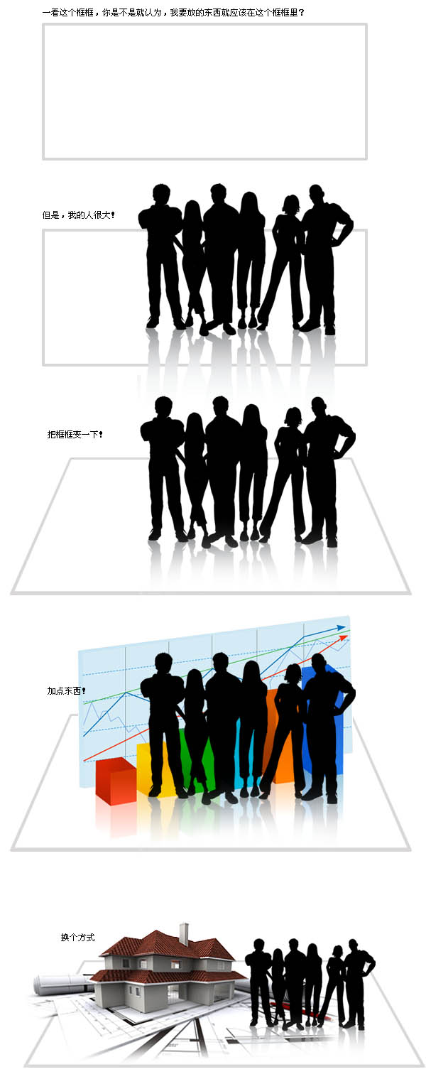 其实很简单,把思维习惯反过来即可。一般情况下,比如某个人,是在限定的一个区域内。那么,我们把它们反过来,让人物的体积大于区域,让人物显示正常,让区域进行透视!