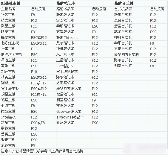 | 映泰主板 | F9 | 神舟台式机 | F12 | 华硕笔记本 | ESC |