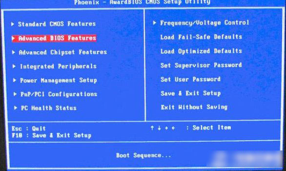 同样的开机按Del键进入该BIOS设置界面,选择高级BIOS设置:Advanced BIOS Features,如上图: