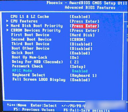 也是选择高级BIOS设置(Advanced BIOS Features)界面,首先选择硬盘启动优先级:Hard Disk Boot Priority,如上图 。