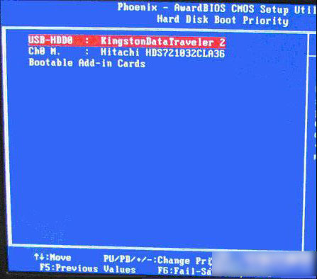 如上图,在高级BIOS设置(Advanced BIOS Features)界面里,首先点击(硬盘启动优先级)Hard Disk Boot Priority,之后即可进入BIOS开机启动项优先级选择,我们可以通过键盘上的上下键选择USB-HDD(U盘即可,会自动识别我们插入电脑中的U盘),如下图: