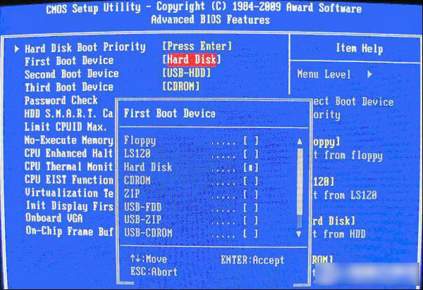 如上图,在第一启动设备(First Boot Device)这里,有U盘的USB-ZIP、USB-HDD之类的选项,我们既可以选择“Hard Disk”,也可以选择“USB-HDD”之类的选项,来启动电脑。