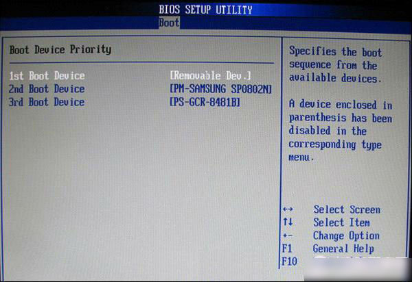 在的硬盘驱动器“Hard Disk Drives”里面还没选择U盘为第一启动设备,那么这里就不存在和显示U盘,如上图所示,但可以选择移动设备“Removable Dev.”作为第一启动设备;