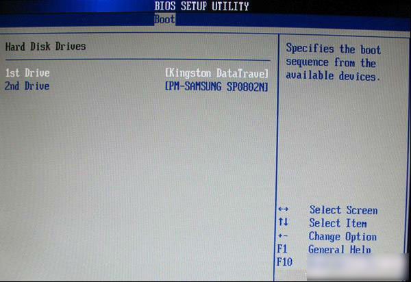 上图硬盘驱动器“Hard Disk Drives”选择:选择U盘为第一启动设备“1st Drive”。如果先在“Hard Disk Drives”里面选择U盘为第一启动设备,如图3-2所示,那么这里就会显示有U盘,那就选择U盘为第一启动设备,如图下图所示。