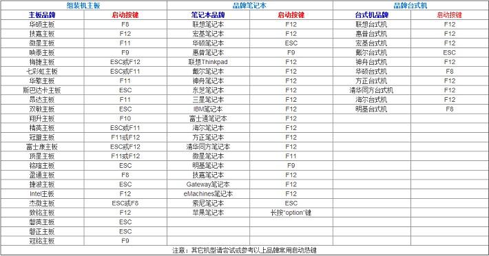 | 主板品牌 | 启动按键 | 台式机品牌 | 启动按键 | 笔记本品牌 | 启动按键 |