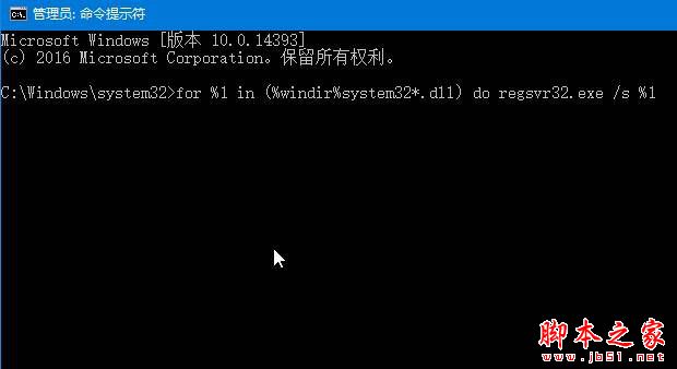2、在命令提示符框中输入:【for %1 in (%windir%system32*.ocx) do regsvr32 /s %1】 按下回车键,接着在命令提示符框中输入【for %1 in (%windir%system32*.dll) do regsvr32.exe /s %1】 按下回车键,等待屏幕滚动完之后重启计算机;