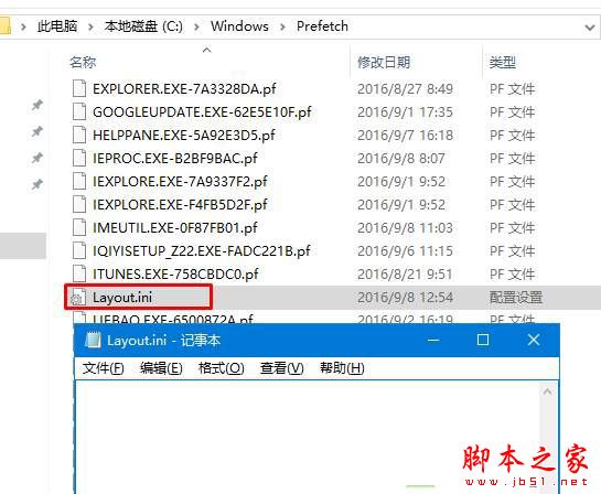 3、打开计算机,打开:C:\Windows\Prefetch,然后双击打开“Layout.ini”,将里面的所有内容清空,保存。