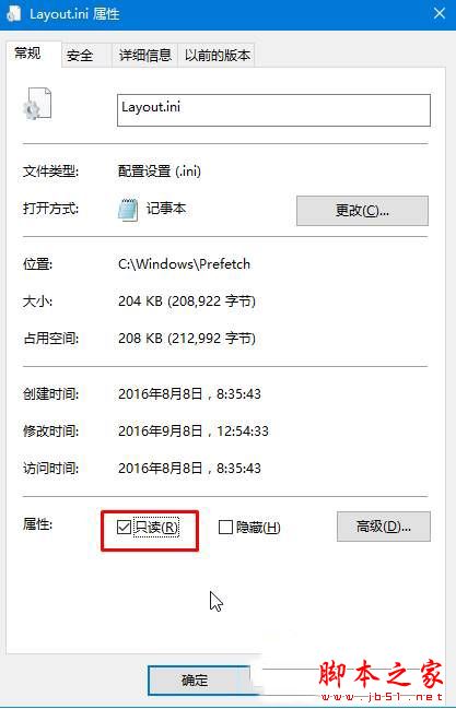 4、在“Layout.ini”文件上单击右键,选择属性,勾选“只读”,然后点击应用并确定;