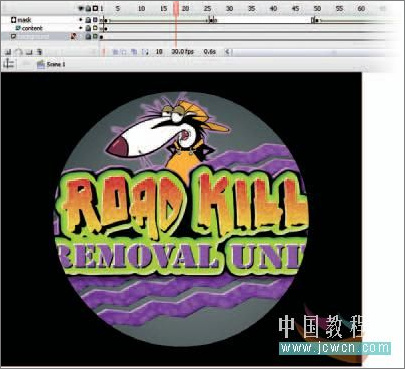 6、自此你已经用一个动画遮罩创建了一个光圈效果。你以在舞台上很容易控制光圈的聚焦区域。在最后一个关键帧,定位圆在角色的眼晴上。当动画播放时,圆将向眼睛上运动-一个被使用在各个卡通中的典型的技巧。