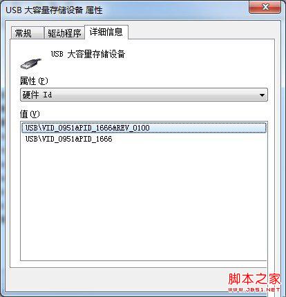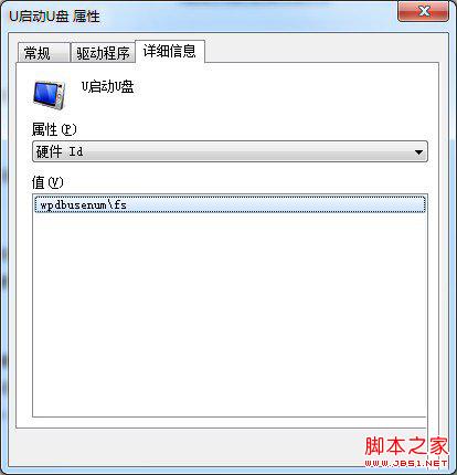 2、右键点击u盘选择“属性”,在弹出的“属性”窗口中点击“详细信息”标签,然后在设备“属性”下拉框中选择“硬件ID”,下面的“值”中会出现字符串,这个就是u盘的硬件ID,将其复制出来即可。如下图所示: