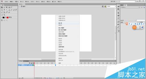 1)首先介绍插入帧的方法,可在时间轴中30帧处按鼠标右键,选择插入帧,