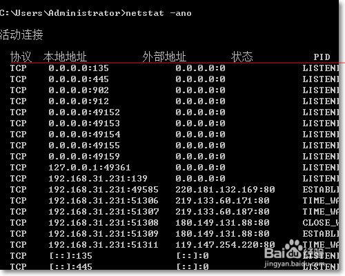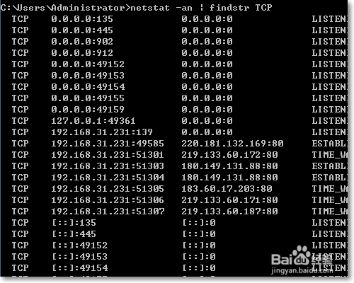 首先我们在Windows命令提示符里边查看当前使用有哪些TCP端口