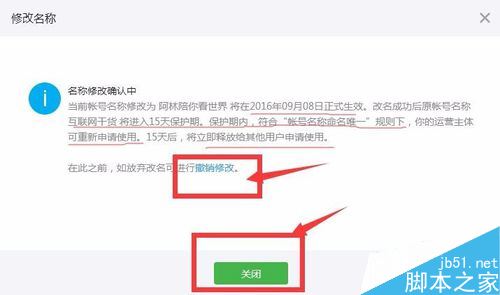 当我们修改好了,这时候就会出现下面的说明,名称有一个15天的保护期和赎回期,而且我们还能撤销修改!