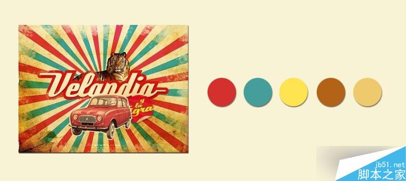 常见使用的颜色有红色,蓝色,米色,淡黄色。我推荐一种选择配色的保险方法,就是在网上寻找颜色你喜欢的复古海报,从中提取配色来设计你的海报。