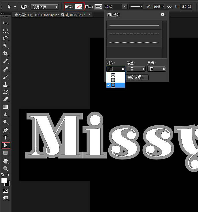 4、复制文本形状图层,用直接选择工具选项栏的形状设置。 改变成没有填充,描边颜色灰色,描边大小10,对齐到外面。