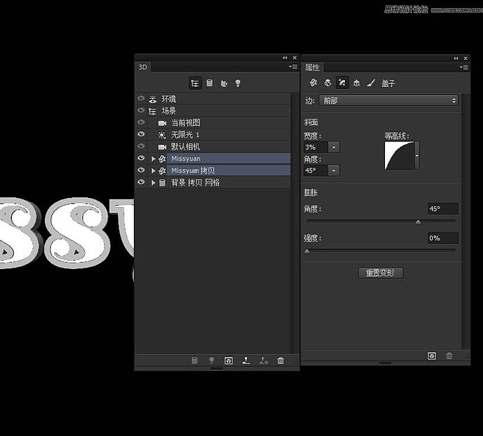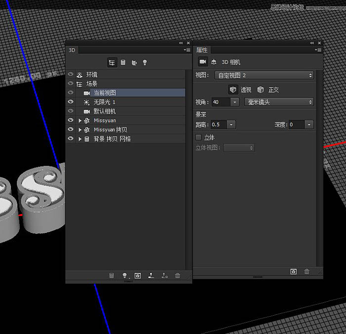 8、打开3D面板和属性面板,(窗口菜单下找到)。在3D面板选择文本形状网格名称标签(选择一个然后Ctrl/Cmd +选择其他),改变挤压深度值在属性面板数值自定。
