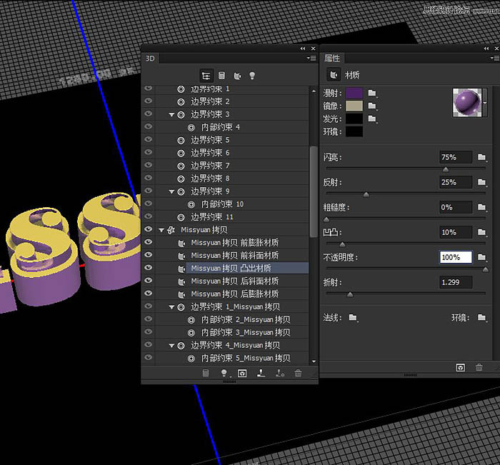 16、选择文本外部凸出材质标签,删除漫反射纹理,然后改变漫射颜色#4b2262,镜像#a7a188,闪亮75%,反射25%,折射到1.3。