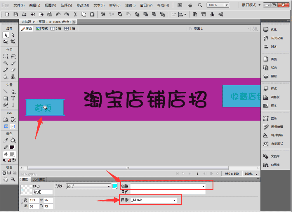 4、在店招上要加链接的地方画个矩形,所选中的范围就是点击可以加链接的地方。将店铺首页的链接和收藏链接分别添加进去就可以了。注意目标要选择_blank!