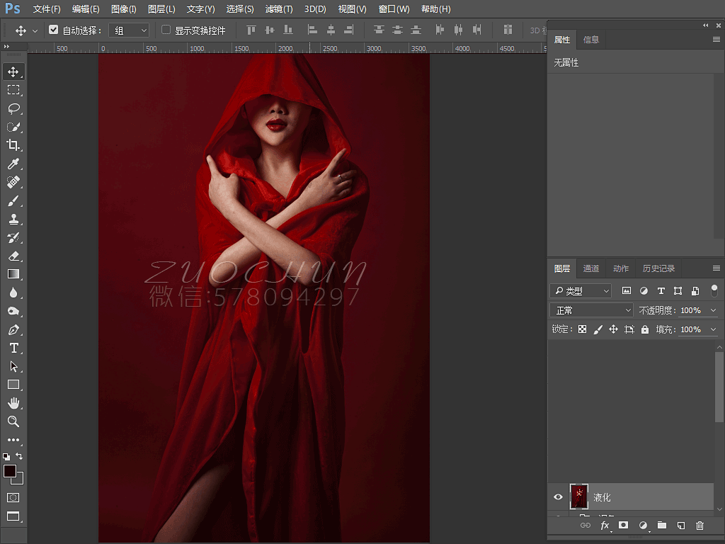 今天这个调色教程是内景红色背景,我比较喜欢暗深红,暗调会给人一种神秘的感觉,根据照片定颜色,颓废,另类,前卫,或者体现层次感可以使用暗调,人物的液化在今天的教程也是一个亮点, 这张照片看不到脸,一定要把脸型和身材,衣服的走向液好,正因为看不到脸所以更体现了照片整体的神秘感,开始调色吧。