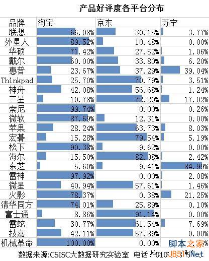 因为是针对电销渠道,具体到淘宝、京东、苏宁三大平台上,淘宝平台对外星人、索尼、微软、松下、雷神、机械革命等品牌的产品好评度有较大贡献;Tinkpad、三星、宏碁、海尔、富士通等品牌产品好评度对京东平台的依附程度较大;东芝笔记本电脑主要依靠苏宁平台。
