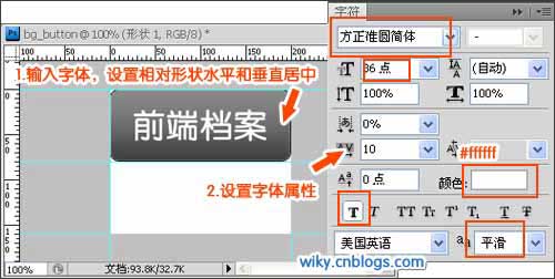 输入文本,设置文字相对水平和垂直居中,字体为方正准圆简体,字号36点,加粗平滑,颜色为白色(#FFFFFF),如下图: