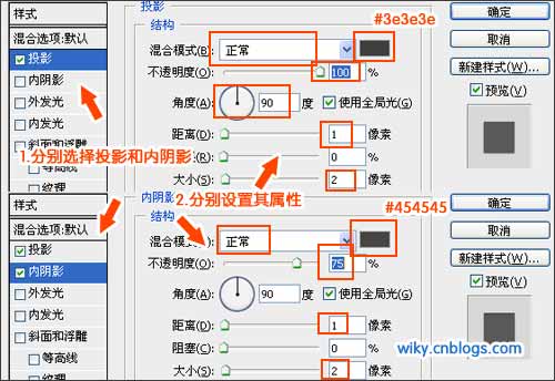 同样的双击文字图层,打开文字图层样式,设置字体样式,点击“投影”,设置混合模式为“正常”,颜色为#3e3e3e,不透明度为100%,角度为90度,距离为1像素,大小为2像素;点击“内阴影”,设置混合模式为“正常”,颜色为#454545,不透明度为75%,角度为90度,距离为1像素,大小为2像素,如下图所示: