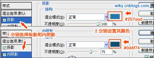 打开字体图层样式,选择“投影”,修改投影颜色为#207aad;选择“内阴影”,修改字体颜色为#0d4f74,如下图: