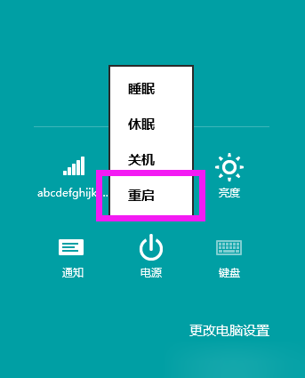 1.将鼠标移到右下角,打开设置,这时按住键盘Shift键同时鼠标左键点击下方快捷按钮中的电源按钮,弹出选项,选择重启,之后系统会自动进入高级选项菜单,如下图所示。