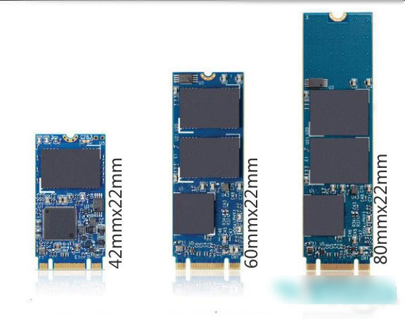 与之前mSATA SSD类似,M.2 SSD也不带金属外壳。主要有2242、2260、2280三种规格,为了划分不同长度的产品而定的。长度不同,意味着容量就不同。因为长度越长,可布置的闪存颗粒就越多,容量也就越大。以M.2 2242为例,22是宽度22mm,42是长度42mm,2260与2280同为此理,所以选购前也要看看你的设备到底支持哪一种长度的M.2 SSD。至于M.2 SSD的厚度,单面布置芯片厚度2.75mm,双面厚度3.85mm,比mSATA还要薄。