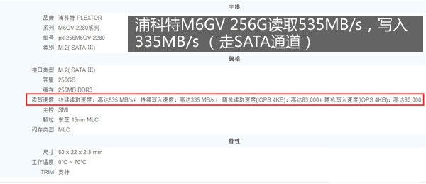 由于M.2 SSD有两种不同通道,性能上有很大的差距。比如浦科特M6e 支持的是高速PCI Express x2存储介面,而同样为M.2接口的浦科特M6GV采用的是SATA存储介面。走的路不一样,性能也就截然不同了。就像一辆车,在高速公路和在崎岖山路上速度会截然不同。