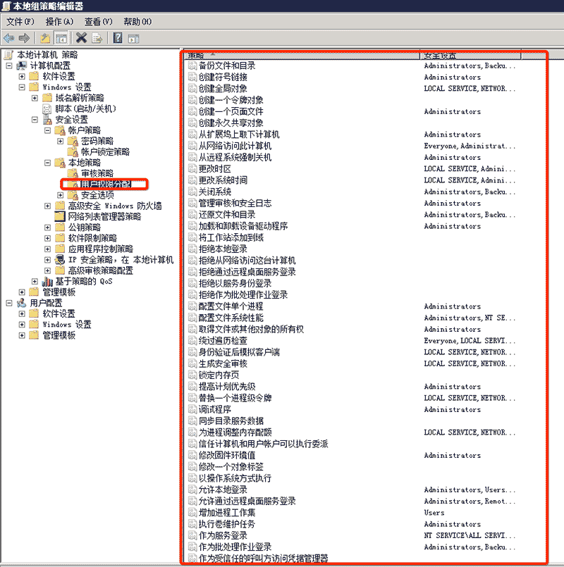 在本地安全设置中,配置指定授权用户允许本地登陆此计算机。