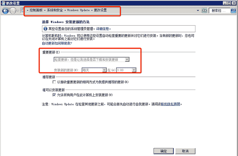 注意:对于实际业务环境服务器,建议使用通知并自动下载更新,但由管理员选择是否安装更新,而不是使用自动安装更新,防止自动更新补丁对实际业务环境产生影响。