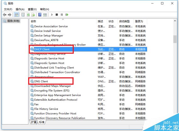 Win+R组合键之后输入services.msc,进入Windows服务,在右侧找到“DHCP Client”和“DNS Client”这两个项目,检查下它们的启动类型是否为“自动”,是的话就开始下一步,不是的话改成“自动”后重启下电脑。