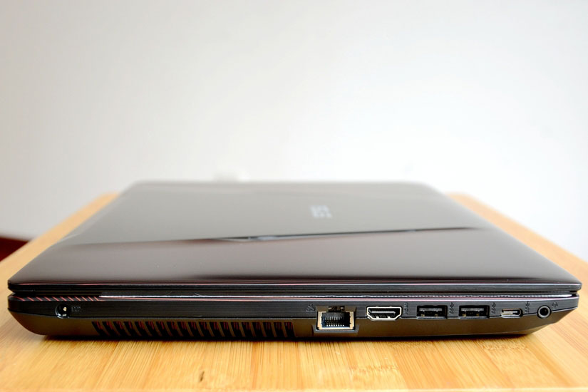 这款机身的厚度为3.0cm,算不上轻薄了,不过大家也了解游戏本,基本上都是傻笨重。左侧的接口比较集中,包括散热口和电源口也都在左侧。