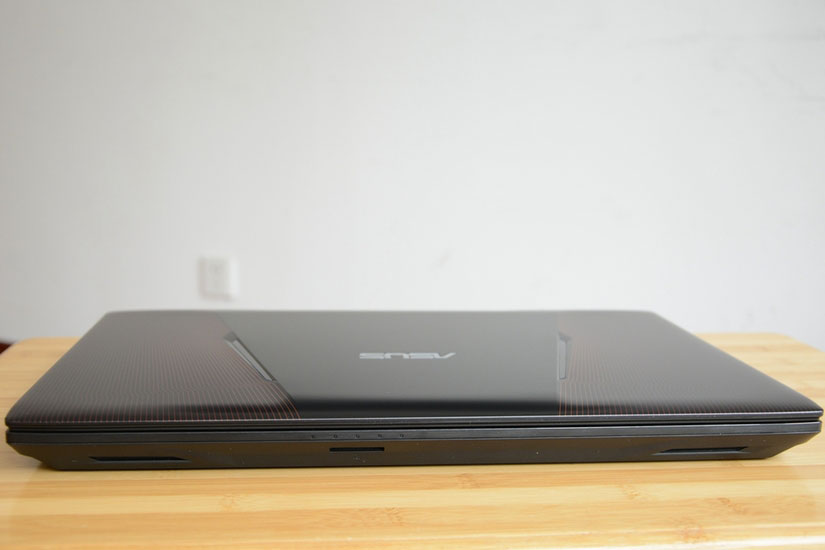 与其它型号不同的是,这款ZX53V系列在外观上采用了黑红搭配,在A面和键盘区设计了一些平行而不规则的暗红色线条,这些线条看上去毫无疑问给机器带来了一些视觉冲击。不过在整机模具方面,基本上没有变化。A面手感镜面,比较容易沾染指纹,也比较怕划伤。