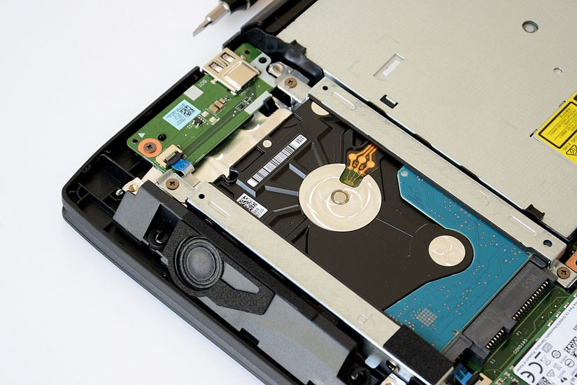 光驱的固定螺钉在内部,有两颗。在确定要拆解前,请先卸下内置的电池,以免触电。
