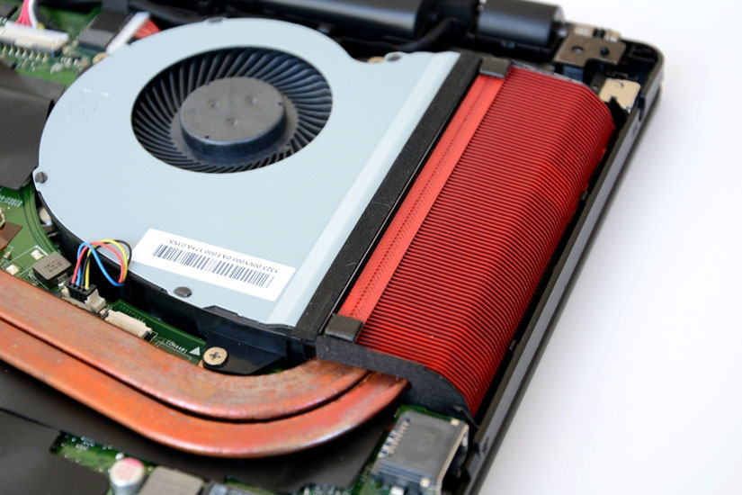 接下来是散热系统,先把风扇拆下来,涡轮风扇,看着比较大,感觉很有力。实际测试效果也不错。红色的散热片比较密集,导热铜管的用料也足。
