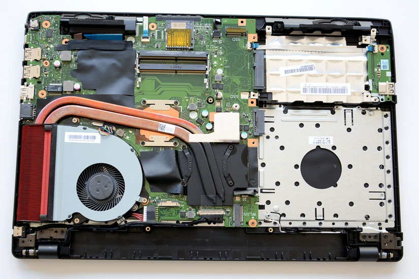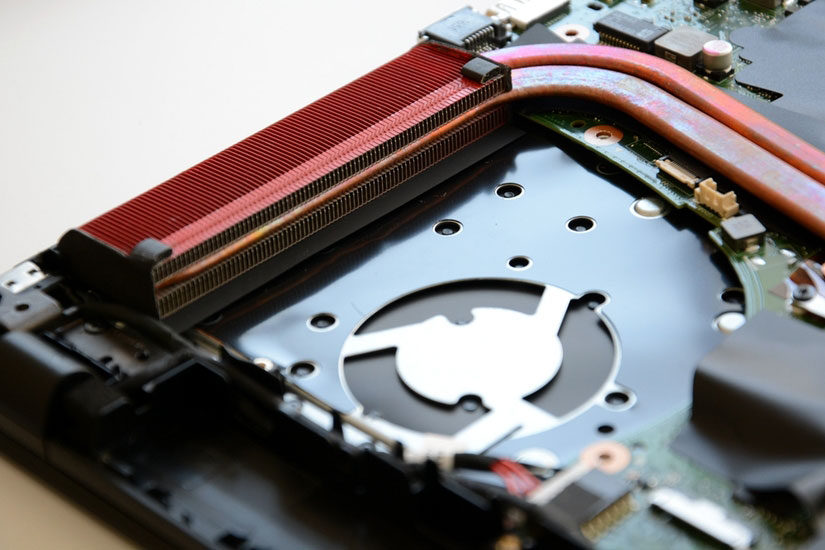打开后盖,内部的配件、主板、散热管都一览无余了。第一眼看上去会以为很乱的样子,实际上是用了很多的贴纸来保护配件,比如防尘、隔热。