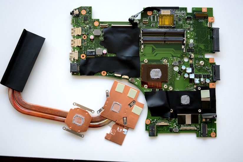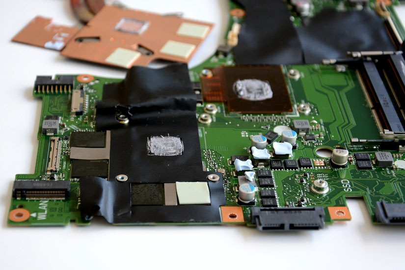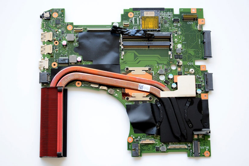 拧下处理器和显卡上的固定螺钉,就可以把铜管取下了。可以看到所有被覆盖的配件都使用了导热硅脂和导热胶片,用料十足。
