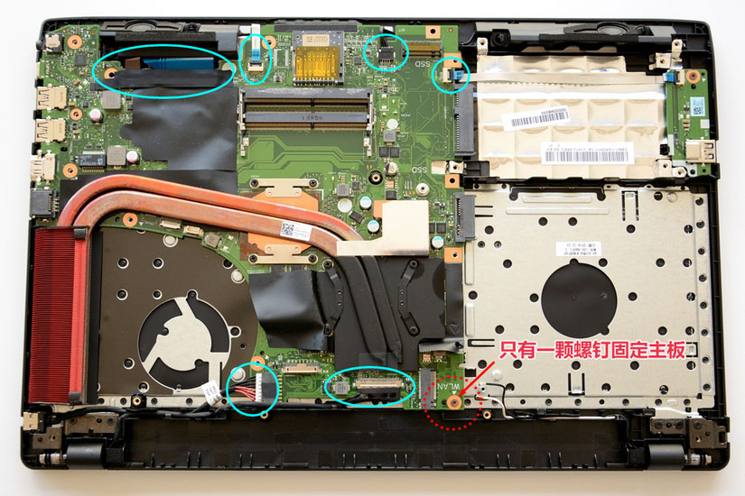 想要拆下主板,需要首先拆掉所有的连接线,无须记住位置,主要是注意别弄断了,以及在安装的时候要到位。主板只有一颗螺钉固定,而且是在无线模块下面,所以一定要拆下无线。
