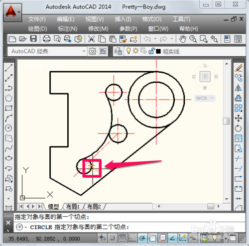 5、同上面方法一样,接着输入“tan”,在第2个圆上捕捉切点。
