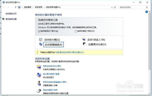 1.使用WIN+U进入“轻松使用设置中心“点击”启动屏幕键盘(K)“即可开启
