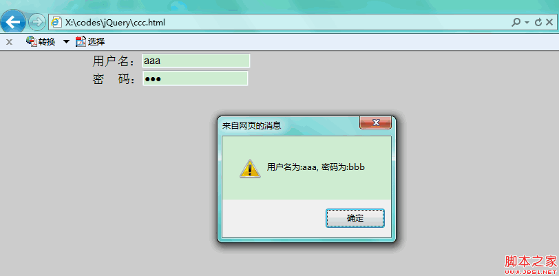 alert("用户名为:" + $('#user').val() + ", 密码为:" + $('#passwd').val());